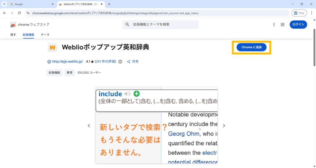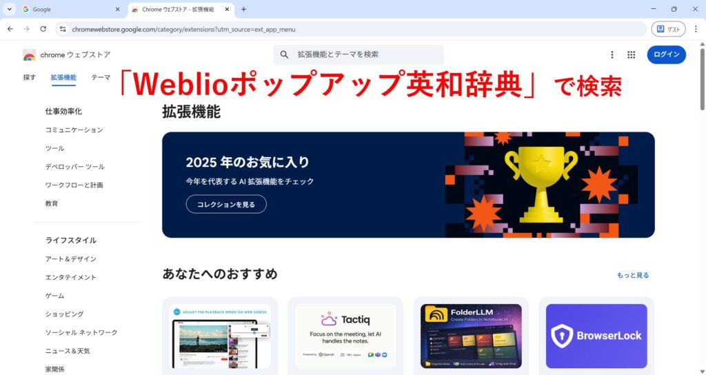 - 「拡張機能」のタブを選択し、画面上部の検索バーで「Weblio ポップアップ英和辞典」を検索します。