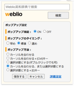 - 「Weblio ポップアップ英和辞典」をクリックすると、ポップアップ設定画面が表示されます。