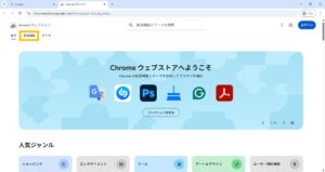 - Google Chromeを起動し、画面右上の3点リーダーの中の「拡張機能」、「Chrome ウェブストアにアクセス」をクリックします。