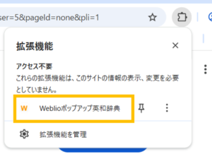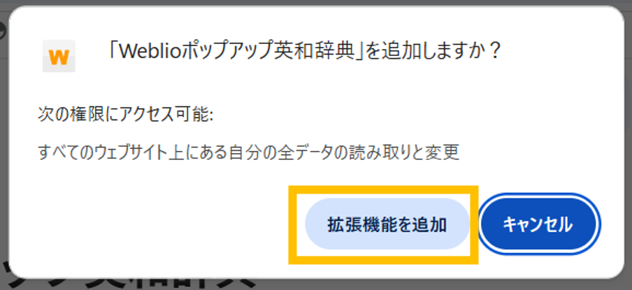 - 「Weblio ポップアップ英和辞典」を追加しますか?と表示されるため、「拡張機能を追加」をクリックし、機能が追加されます。